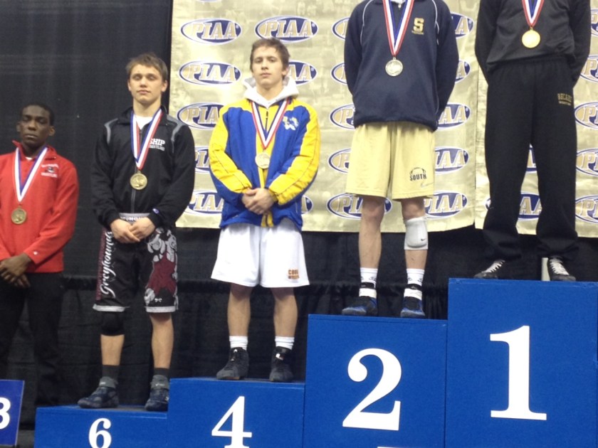 As the snow could not stop the 2014-2015 PIAA Wrestling Championships in Hershey, PA, Downingtown East Wrestling marched forward and captured its second state medal in its 11 year history. Co-captain and 126 lb. standout Wade Cummings, claimed the 4th place prize and the honor of highest placing Chesmont League and Chester County wrestler with a tournament record of 4-2. Congratulations also go out to senior co-captains James Meyer (152, 1-2) and Billy McGinley (220, 3-2) who battled the toughest wrestlers in the commonwealth to etch their names in Downingtown East Wrestling history. The 14-15 season marked many milestones for the Cougars and their coaches, and their PIAA finish is a testament to their diligence and belief throughout the year. We’ll celebrate a memorable season next Sunday 3/15, with our annual banquet at Whitford Country Club, 5 to 8pm. Come with fond memories, an appetite for celebration, and a curiosity for what lies next for Cougar Wrestling: It’s never too early to plan for the next campaign! INVICTUS